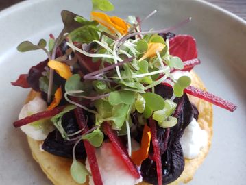 Cheese Crust topped with Whipped Goat Cheese, Fresh and Pickled Beets and Micro Green Salad