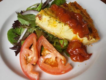 I Also Do Brunch! Fluffy Quiche filled with Bacon and Spinach, topped with a Tomato Jam, Resting on top of a Fresh Salad