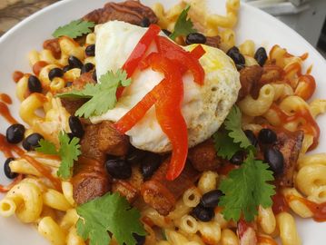 Cavatappi Pasta tossed in Luscious cheese sauce with Black Beans, Roasted Tomatoes, Red Enchilada Sauce, Spiced Grilled Pork, Fresh Cilantro, Pickled Red Peppers and a Fried Egg