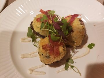 Portabella Mushroom Caps Stuffed With Pimento Cheese and Bacon, Horseradish Cream and Micro Greens