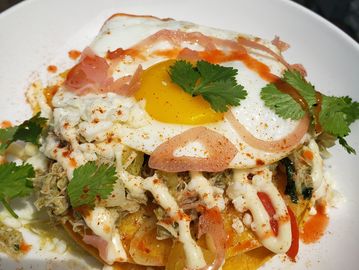 Pulled Chicken Tostada with Salsa Verde, Lime Crema, Fresh Cilantro, Pickled Red Onions a splash of hot sauce and A Sunny Side up Egg