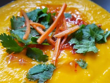 Curried Carrot Soup with Lightly Pickled Carrots, Fresh Cilantro and Thai Chili Sauce