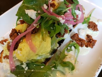 Toasted Ciabatta topped with Guacamole, Soft Scrambled Eggs, Chorizo Sausage, Arugula, Pickled Red Onions and Queso Fresco drizzled with Cilantro Lime Crema