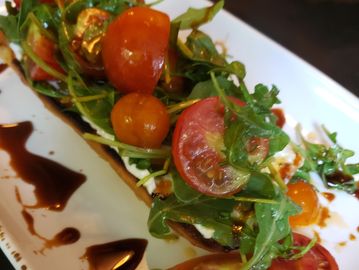 Toasted Ciabatta with Goat Cheese Schmear, Arugula Salad and Farm Fresh Cherry Tomatoes, Bacon Lardons and Aged Balsamic Glaze