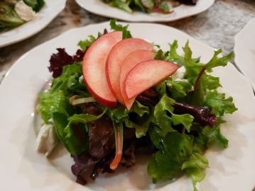 Mixed Greens Tossed in a Honey Apple Vinaigrette, Topped with Fresh apple, Goat Cheese, Candied Pumpkin Seeds and Red Onion
