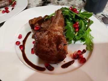 Lamb Lollies with Arugula Salad, Pomegranate Tendrils and Red Wine Demi
