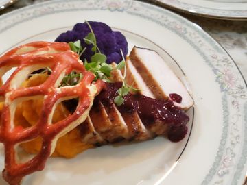 Apple Cider Brined Pork Chops with Sweet Potato Puree, Roasted Purple Cauliflower, Blackberry Demi and Puff Pastry Cage
