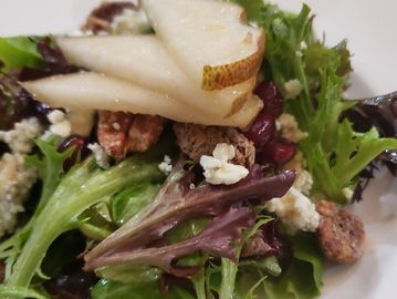 Mixed Greens tossed with a Champagne Vinaigrette, Blue Cheese Crumbles, Pomegranate Tendrils and Candied Pecans