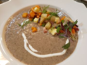 Roasted Mushrooms Blended with Potato and Cream, drizzled with Creme Fraiche, Garnished with Sweet Potato, Bacon and Parsnip Hash, With Dill and other fresh Herbs