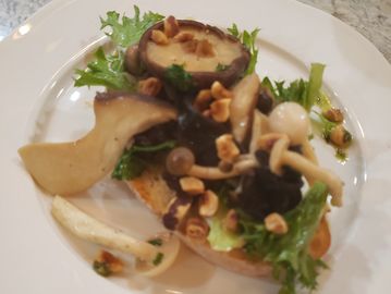 Mushrooms Sautéed in Garlic Butter, served on top of Brioche Toast with Lemon Creme Fraiche, Frissee Salad and Toasted Hazelnuts.