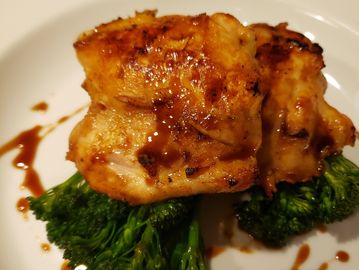 Pan Roasted Lemon Infused Chicken, Sautéed Broccolini and deglazed Pan Sauce (served with Orzo pasta not shown)