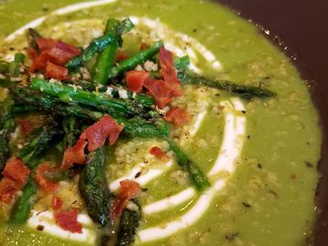 Fresh Asparagus and Green Pea Soup topped with roasted Asparagus tops, Bacon Lardons, Lemon Creme Fraiche and Herbed Granita
